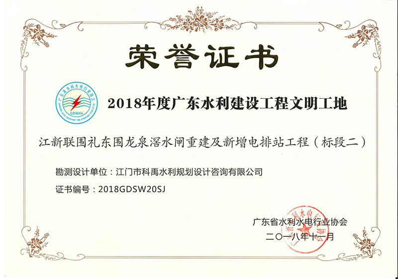 江新聯(lián)圍禮東圍龍泉滘水閘重建及新增電排站工程榮獲文明工地