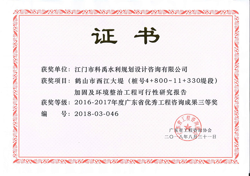 鶴山市西江大堤加固及環(huán)境整治工程可行性研究報(bào)告榮獲省三等獎(jiǎng)