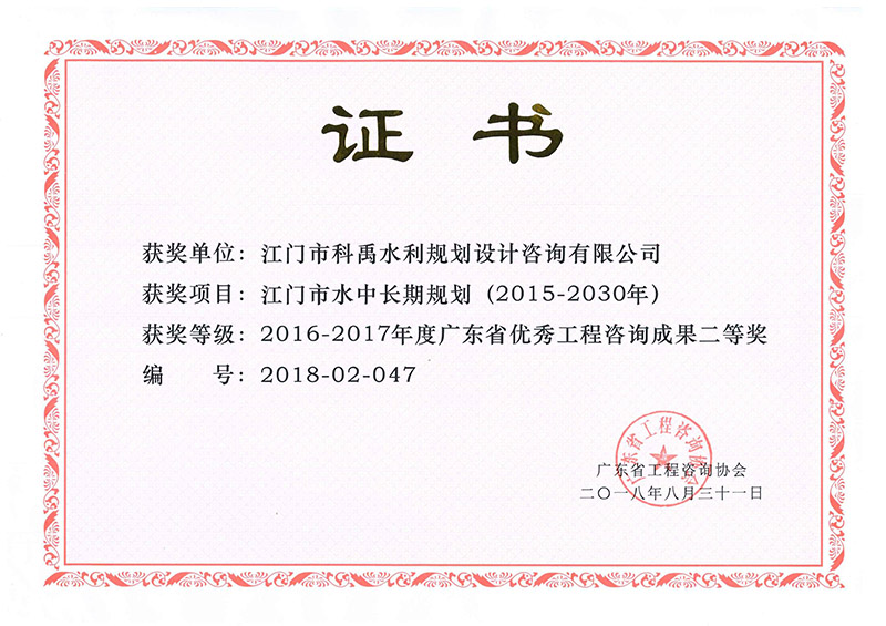 江門市水中長期規(guī)劃(2015-2030年)榮獲省優(yōu)秀工程咨詢成果二等獎