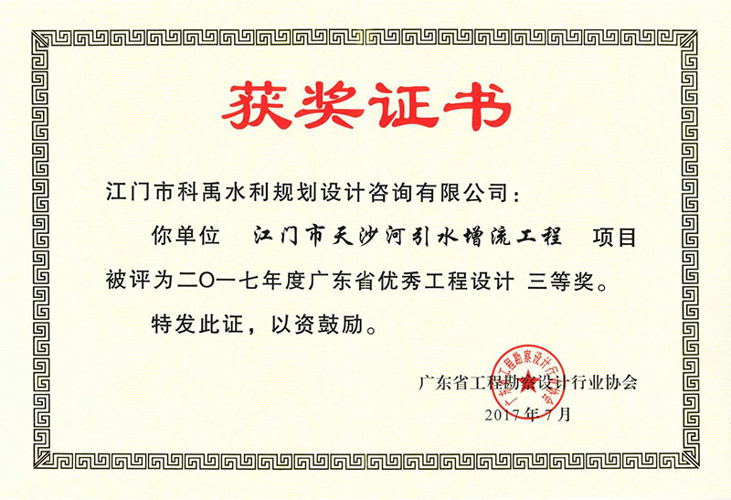江門市天沙河引水增流工程獲省優(yōu)秀工程設(shè)計(jì)三等獎(jiǎng)