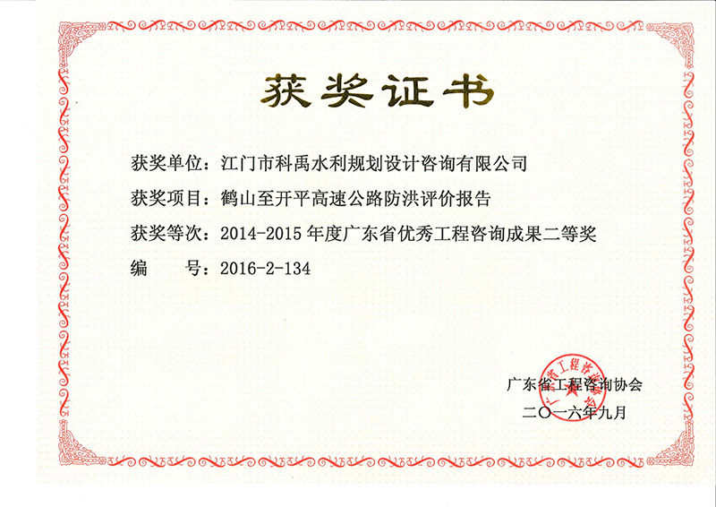 鶴山至開平高速公路防洪評(píng)價(jià)報(bào)告獲省優(yōu)秀工程咨詢成果二等獎(jiǎng)