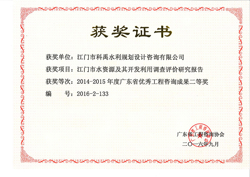 江門市水資源及其開發(fā)利用調(diào)查評(píng)價(jià)報(bào)告獲省優(yōu)秀工程咨詢成果二等獎(jiǎng)