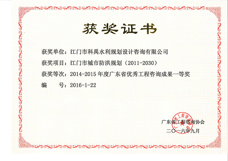 江門市城市防洪規(guī)劃(2011-2030)獲省優(yōu)秀工程咨詢成果一等獎