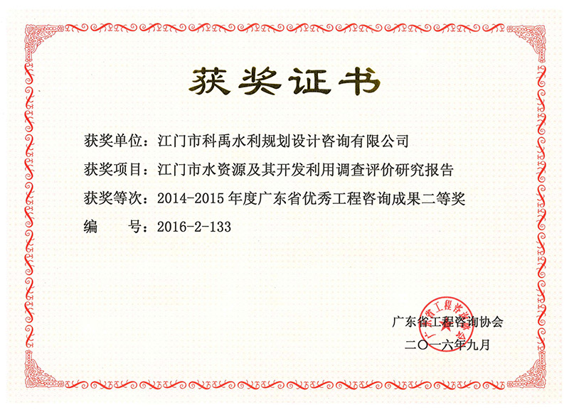 江門市水資源及其開發(fā)利用調(diào)查評(píng)價(jià)研究報(bào)告獲省優(yōu)秀工程咨詢成果二等獎(jiǎng)