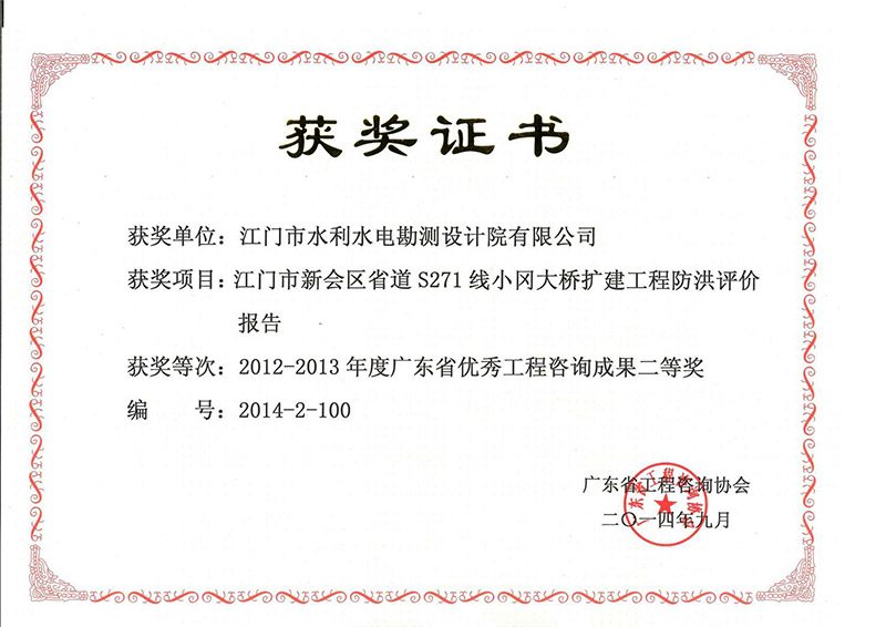新會(huì)省道S271線小岡大橋擴(kuò)建工程防洪評(píng)價(jià)獲省優(yōu)秀工程咨詢二等獎(jiǎng)