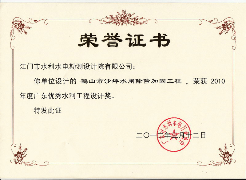 沙坪水閘榮獲2010年度廣東優(yōu)秀水利工程設(shè)計獎