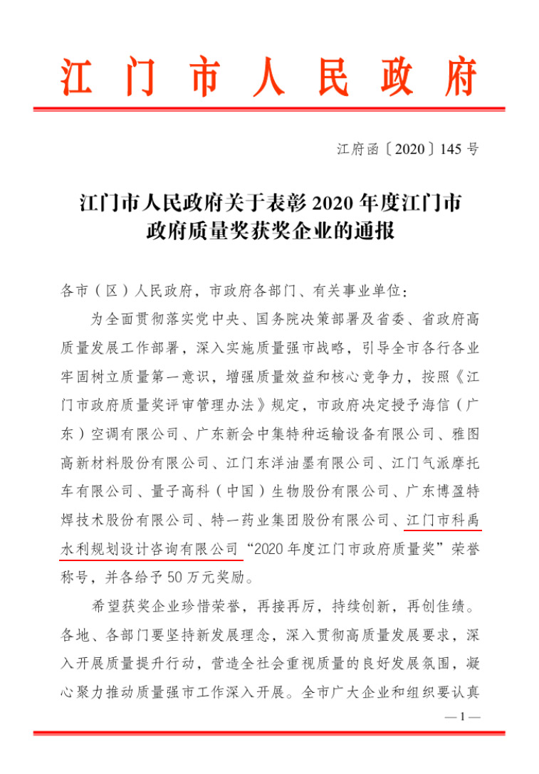 10月16日,江門市人民政府發(fā)布《關(guān)于表彰2020年度江門市政府質(zhì)量獎(jiǎng)獲獎(jiǎng)企業(yè)的通報(bào)》,我公司榮獲江門市質(zhì)量領(lǐng)域最高榮譽(yù)——“江門市政府質(zhì)量獎(jiǎng)”。