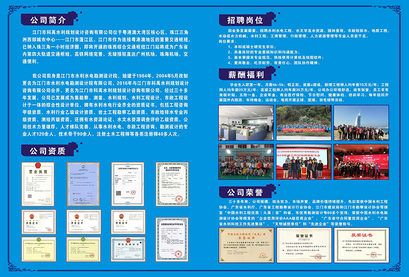 我公司前身是江門市水利水電勘測設(shè)計院,始建于1984年,2004年5月改制更名為江門市水利水電勘測設(shè)計院有限公司,2016年與江門市科禹水利規(guī)劃設(shè)計咨詢有限公司合并,更名為江門市科禹水利規(guī)劃設(shè)計咨詢有限公司。經(jīng)過三十多年發(fā)展,公司已發(fā)展成為集勘察、測量、水利規(guī)劃、水利工程設(shè)計、市政工程設(shè)計于一體的綜合性設(shè)計單位,擁有水利水電行業(yè)齊全的資質(zhì)證書,包括工程咨詢甲級資質(zhì)、水利行業(yè)乙級設(shè)計資質(zhì)、巖土工程勘察乙級資質(zhì)、市政給排水專業(yè)丙級資質(zhì)、測繪丙級資質(zhì),還擁有水資源論證、水文水資源調(diào)查評價乙級資質(zhì)。公司技術(shù)力量雄厚,人才梯隊完善,從事水利水電、市政工程咨詢、勘測設(shè)計的專業(yè)人才120余人,技術(shù)骨干90余人,注冊土木工程師等各類注冊師40多人次。