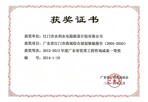 江門市流域綜合規(guī)劃(2005-2030)獲省優(yōu)秀工程咨詢成果一等獎(jiǎng)