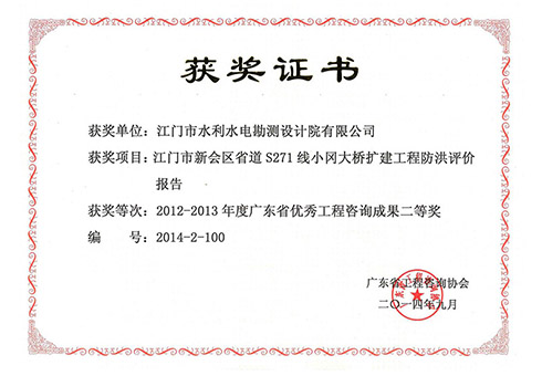 新會(huì)省道S271線小岡大橋擴(kuò)建工程防洪評(píng)價(jià)獲省優(yōu)秀工程咨詢二等獎(jiǎng)