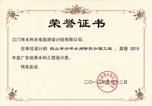 沙坪水閘榮獲2010年度廣東優(yōu)秀水利工程設計獎