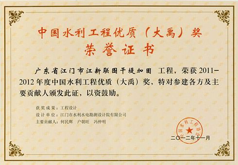 江新聯(lián)圍榮獲2011-2012年度中國水利工優(yōu)質(zhì)(大禹)獎