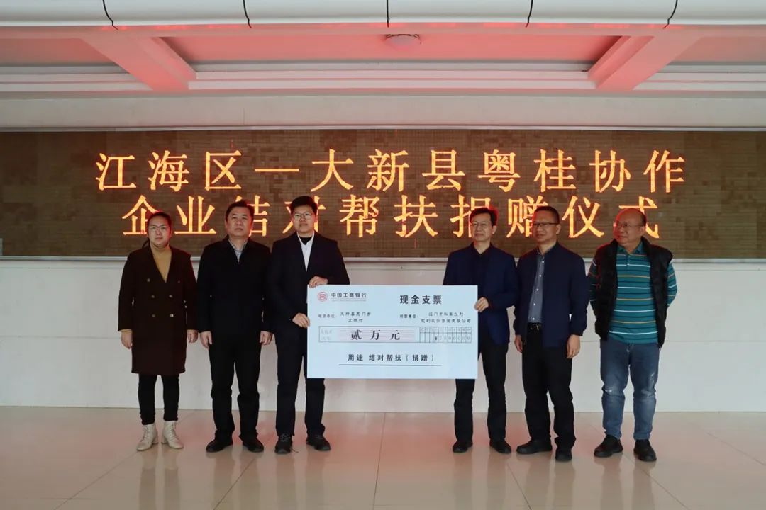 2023年2月7日至9日,我公司赴廣西大新縣開展結(jié)對(duì)幫扶活動(dòng)。在廣西大新縣,我公司參加了在該縣縣委一樓召開的“2023年江海區(qū)-大新縣粵桂協(xié)作對(duì)接會(huì)議”,會(huì)后,我公司與大新縣鄉(xiāng)鎮(zhèn)代表舉行了結(jié)對(duì)幫扶捐贈(zèng)儀式。