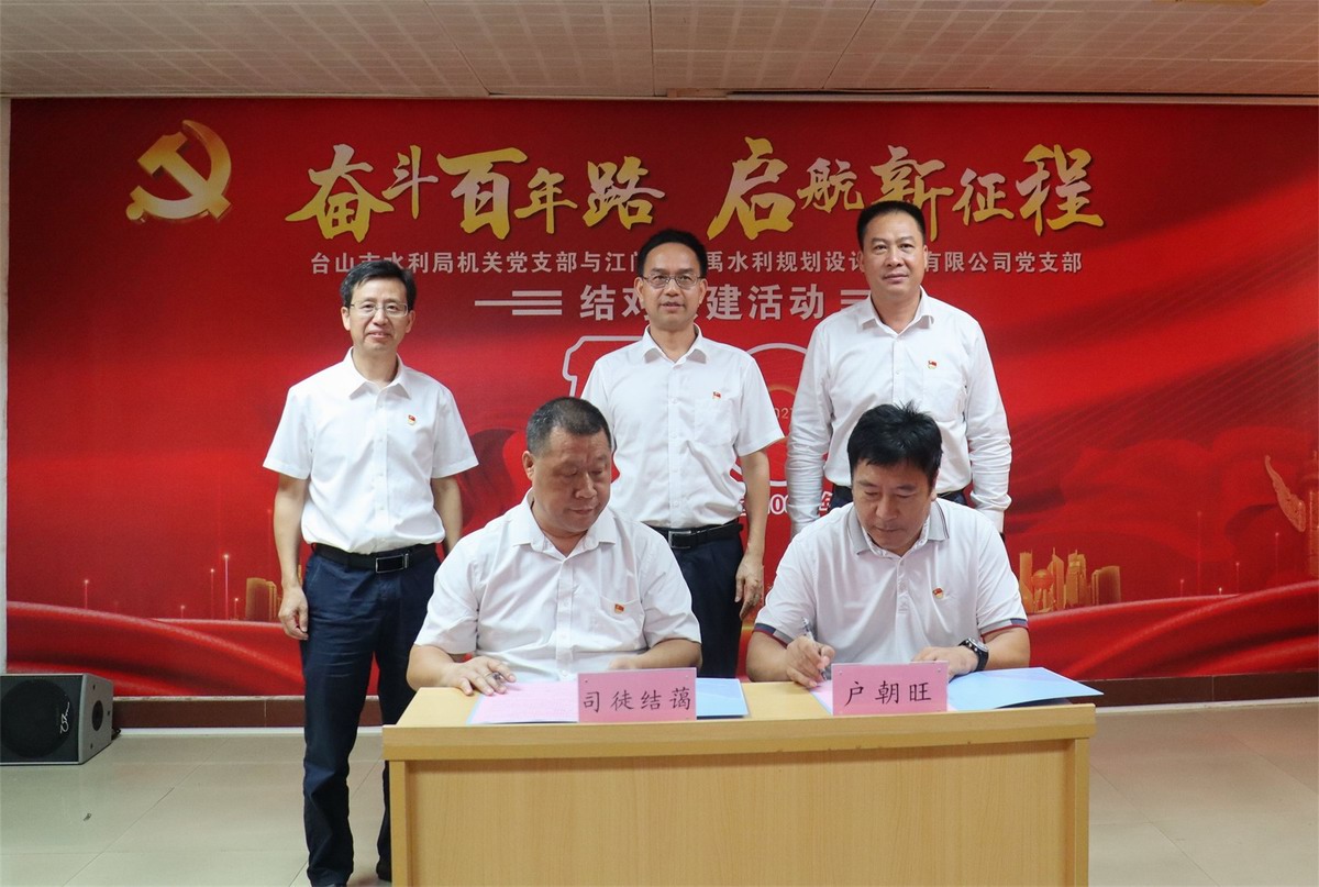 在臺(tái)山市水利局黨組書(shū)記、局長(zhǎng)鄭卓世,江門市科禹水利規(guī)劃設(shè)計(jì)咨詢有限公司董事長(zhǎng)何民輝,臺(tái)山市直機(jī)關(guān)工委書(shū)記譚遠(yuǎn)東的共同見(jiàn)證下,臺(tái)山市水利局機(jī)關(guān)黨支部書(shū)記、副局長(zhǎng)司徒結(jié)藹和江門市科禹水利規(guī)劃設(shè)計(jì)咨詢有限公司黨支部書(shū)記戶朝旺上臺(tái)簽署了結(jié)對(duì)共建協(xié)議書(shū)。